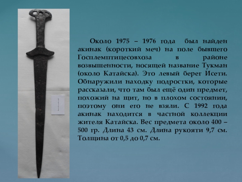 Слайд 15Около 1975 – 1976 года был найден акинак (короткий меч) на