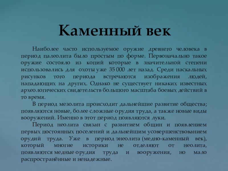простым по форме. Первоначально такое оружие состояло из копий которые в значительной степени использовались для охоты уже 35 000 лет назад. Среди наскальных рисунков того периода встречаются изображения людей, нападающих на других. Однако не существует никаких известных археологических свидетельств большого масштаба боевых действий в то время.
