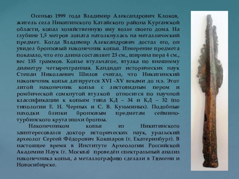 района Курганской области, копал хозяйственную яму возле своего дома. На глубине 1,5 метров лопата натолкнулась на металлический предмет. Когда Владимир Александрович достал его, он увидел бронзовый наконечник копья. Измерение предмета показало, что его длина составляет 23 см., ширина пера 4 см., вес 135 граммов. Копье втульчатое, втулка по внешнему диаметру четырехгранная. Кандидат исторических наук Степан Николаевич Шилов считал, что Никитинский наконечник копья датируется XVI –XV веками до н.э. Этот литой наконечник копья с листовидным пером и ромбической сомкнутой втулкой относится по научной классификации к копьям типа КД – 34 и КД – 32 (по типологии Е. Н. Черных и С. В. Кузьминых). Подобные находки близки бронзовым предметам сеймино-турбинского круга эпохи бронзы.