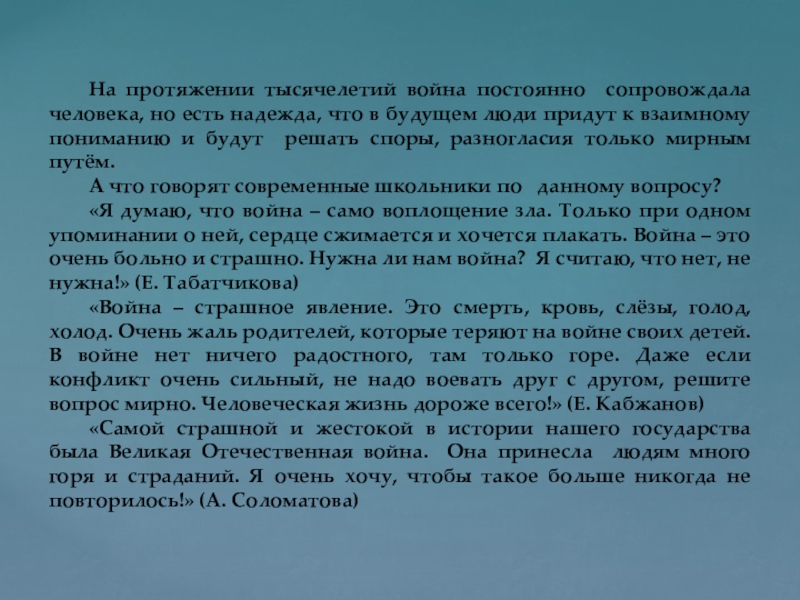 «Самой страшной и жестокой в истории нашего государства была Великая Отечественная война. Она принесла людям много горя и страданий. Я очень хочу, чтобы такое больше никогда не повторилось!» (А. Соломатова)