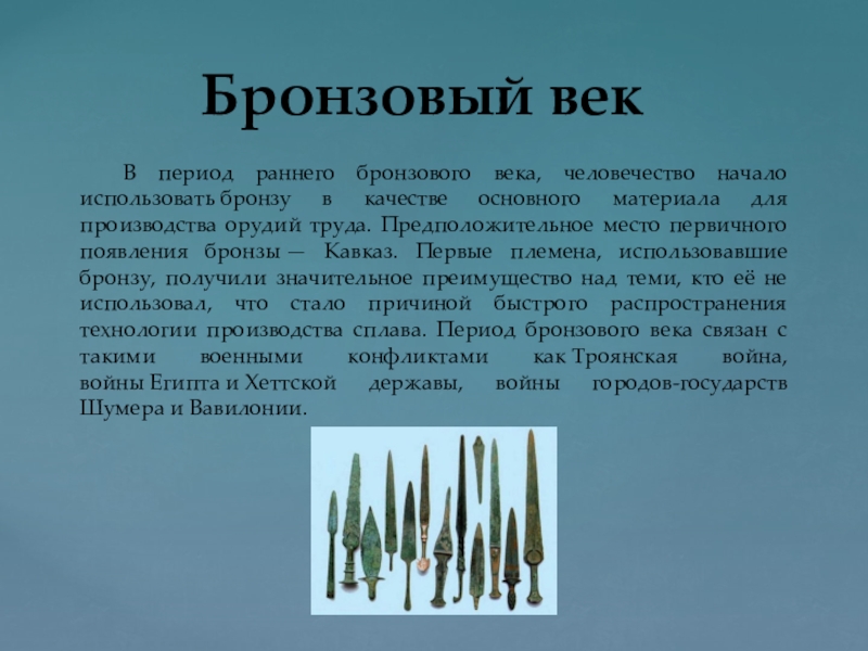 основного материала для производства орудий труда. Предположительное место первичного появления бронзы — Кавказ. Первые племена, использовавшие бронзу, получили значительное преимущество над теми, кто её не использовал, что стало причиной быстрого распространения технологии производства сплава. Период бронзового века связан с такими военными конфликтами как Троянская война, войны Египта и Хеттской державы, войны городов-государств Шумера и Вавилонии.