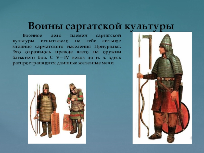влияние сарматского населения Приуралья. Это отразилось прежде всего на оружии ближнего боя. С V—IV веков до н. э. здесь распространяются длинные железные мечи