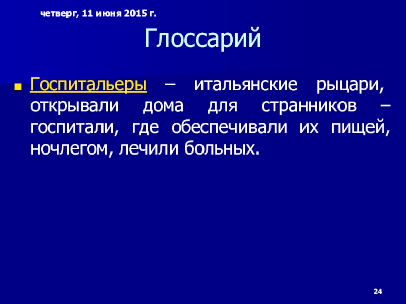 Госпитальеры – итальянские рыцари, открывали дома для странников – госпитали, где