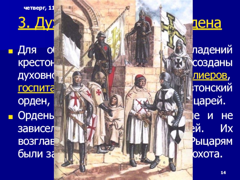 созданы духовно-рыцарские ордена: тамплиеров, госпитальеров, позднее возник Тевтонский орден, объединивший немецких рыцарей.