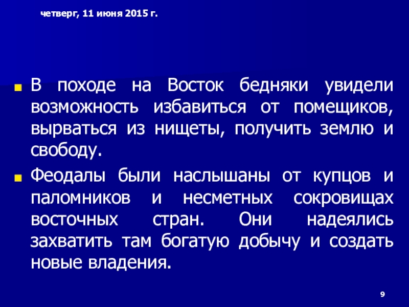 Слайд 9В походе на Восток бедняки увидели возможность избавиться от помещиков, вырваться