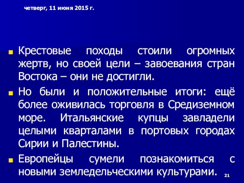 Слайд 21Крестовые походы стоили огромных жертв, но своей цели – завоевания стран