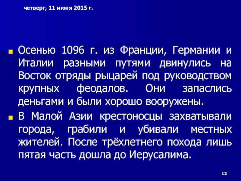 Слайд 12Осенью 1096 г. из Франции, Германии и Италии разными путями двинулись