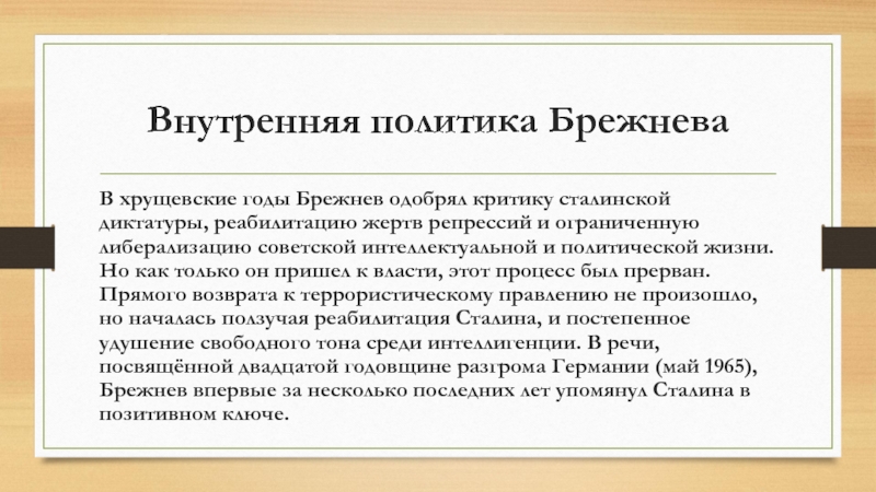 жертв репрессий и ограниченную либерализацию советской интеллектуальной и политической жизни. Но как только он пришел к власти, этот процесс был прерван. Прямого возврата к террористическому правлению не произошло, но началась ползучая реабилитация Сталина, и постепенное удушение свободного тона среди интеллигенции. В речи, посвящённой двадцатой годовщине разгрома Германии (май 1965), Брежнев впервые за несколько последних лет упомянул Сталина в позитивном ключе.