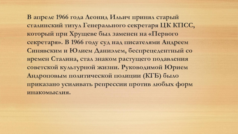 секретаря ЦК КПСС, который при Хрущеве был заменен на «Первого секретаря». В 1966 году суд над писателями Андреем Синявским и Юлием Даниэлем, беспрецедентный со времен Сталина, стал знаком растущего подавления советской культурной жизни. Руководимой Юрием Андроповым политической полиции (КГБ) было приказано усиливать репрессии против любых форм инакомыслия.