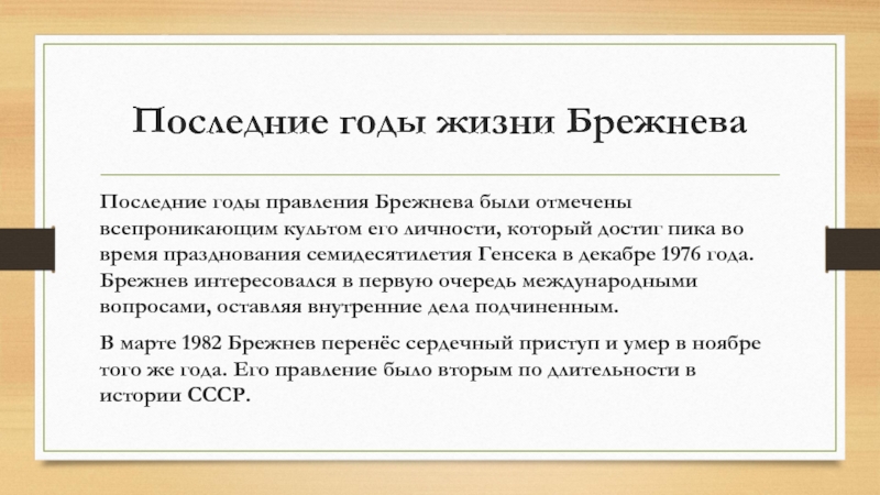 В марте 1982 Брежнев перенёс сердечный приступ и умер в ноябре того же года. Его правление было вторым по длительности в истории СССР.