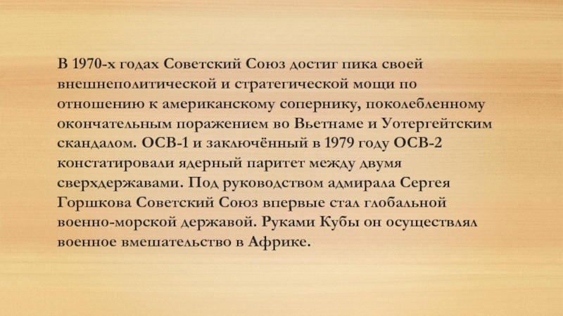 мощи по отношению к американскому сопернику, поколебленному окончательным поражением во Вьетнаме и Уотергейтским скандалом. ОСВ-1 и заключённый в 1979 году ОСВ-2 констатировали ядерный паритет между двумя сверхдержавами. Под руководством адмирала Сергея Горшкова Советский Союз впервые стал глобальной военно-морской державой. Руками Кубы он осуществлял военное вмешательство в Африке.