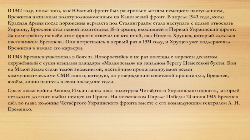немецким наступлением, Брежнева назначили политуполномоченным на Кавказский фронт. В апреле 1943 года, когда Красная Армия после поражения вермахта под Сталинградом стала наступать с целью отвоевать Украину, Брежнев стал главой политотдела 18-й армии, входившей в Первый Украинский фронт. За политработу на всём этом фронте отвечал не кто иной, как Никита Хрущев, который сделался наставником Брежнева. Они встретились в первый раз в 1931 году, и Хрущев уже поддерживал Брежнева в начале его карьеры.