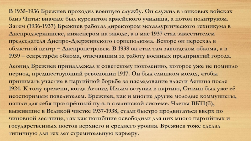близ Читы: вначале был курсантом армейского училища, а потом политруком. Затем (1936-1937) Брежнев работал директором металлургического техникума в Днепродзержинске, инженером на заводе, а в мае 1937 стал заместителем председателя Днепро-Дзержинского горисполкома. Вскоре он переехал в областной центр – Днепропетровск. В 1938 он стал там завотделом обкома, а в 1939 – секретарём обкома, отвечавшим за работу военных предприятий города.