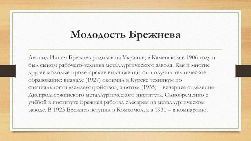 году и был сыном рабочего-техника металлургического завода. Как и многие другие молодые пролетарские выдвиженцы он получил техническое образование: вначале (1927) окончил в Курске техникум по специальности «землеустройство», а потом (1935) – вечернее отделение Днепродзержинского металлургического института. Одновременно с учёбой в институте Брежнев работал слесарем на металлургическом заводе. В 1923 Брежнев вступил в Комсомол, а в 1931 – в компартию.