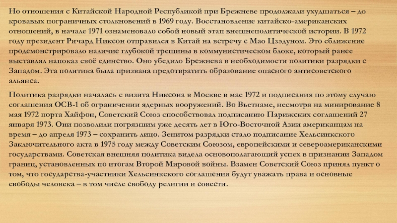 до кровавых пограничных столкновений в 1969 году. Восстановление китайско-американских отношений, в начале 1971 ознаменовало собой новый этап внешнеполитической истории. В 1972 году президент Ричард Никсон отправился в Китай на встречу с Мао Цзэдуном. Это сближение продемонстрировало наличие глубокой трещины в коммунистическом блоке, который ранее выставлял напоказ своё единство. Оно убедило Брежнева в необходимости политики разрядки с Западом. Эта политика была призвана предотвратить образование опасного антисоветского альянса.