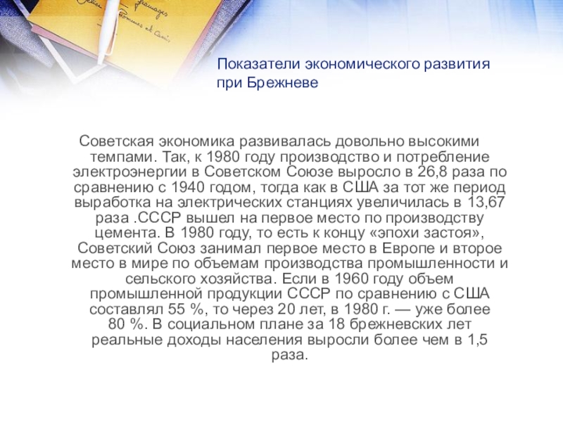 Так, к 1980 году производство и потребление электроэнергии в Советском Союзе выросло в 26,8 раза по сравнению с 1940 годом, тогда как в США за тот же период выработка на электрических станциях увеличилась в 13,67 раза .СССР вышел на первое место по производству цемента. В 1980 году, то есть к концу «эпохи застоя», Советский Союз занимал первое место в Европе и второе место в мире по объемам производства промышленности и сельского хозяйства. Если в 1960 году объем промышленной продукции СССР по сравнению с США составлял 55 %, то через 20 лет, в 1980 г. — уже более 80 %. В социальном плане за 18 брежневских лет реальные доходы населения выросли более чем в 1,5 раза.