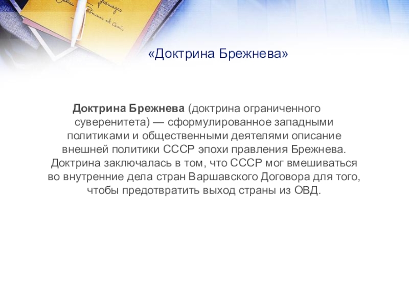 деятелями описание внешней политики СССР эпохи правления Брежнева. Доктрина заключалась в том, что СССР мог вмешиваться во внутренние дела стран Варшавского Договора для того, чтобы предотвратить выход страны из ОВД.