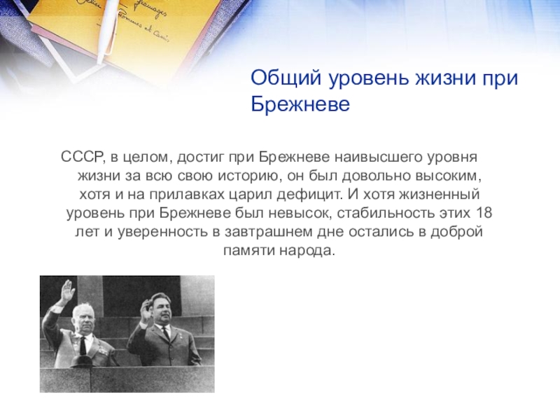уровня жизни за всю свою историю, он был довольно высоким, хотя и на прилавках царил дефицит. И хотя жизненный уровень при Брежневе был невысок, стабильность этих 18 лет и уверенность в завтрашнем дне остались в доброй памяти народа.