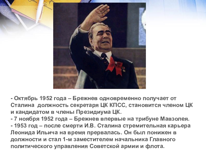 Слайд 8- Октябрь 1952 года – Брежнев одновременно получает от Сталина должность