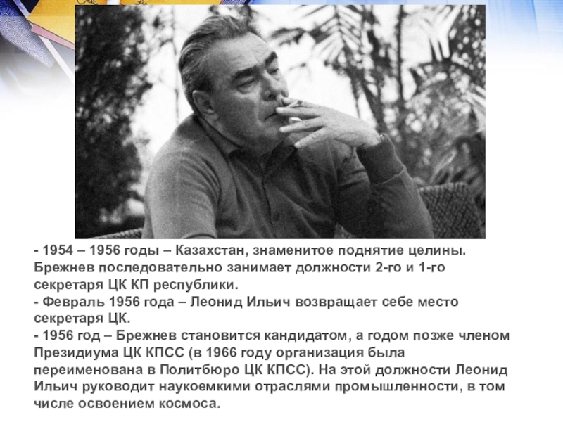 Слайд 9- 1954 – 1956 годы – Казахстан, знаменитое поднятие целины. Брежнев