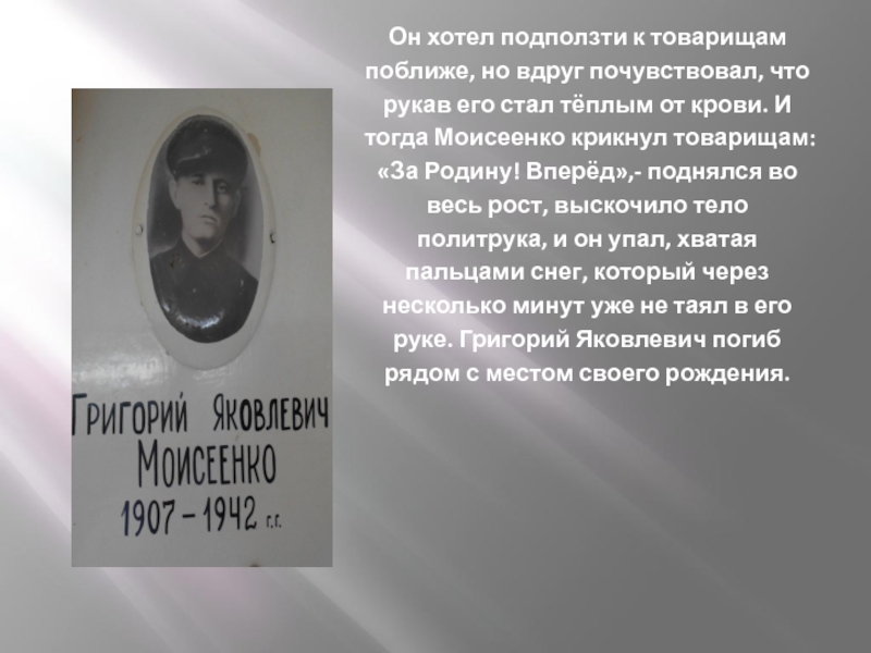его стал тёплым от крови. И тогда Моисеенко крикнул товарищам: «За Родину! Вперёд»,- поднялся во весь рост, выскочило тело политрука, и он упал, хватая пальцами снег, который через несколько минут уже не таял в его руке. Григорий Яковлевич погиб рядом с местом своего рождения.