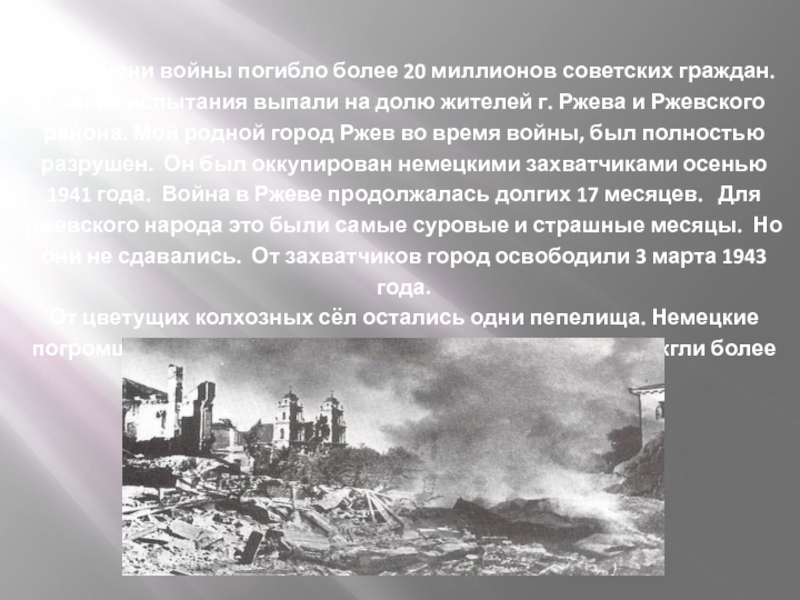 испытания выпали на долю жителей г. Ржева и Ржевского района. Мой родной город Ржев во время войны, был полностью разрушен. Он был оккупирован немецкими захватчиками осенью 1941 года. Война в Ржеве продолжалась долгих 17 месяцев. Для ржевского народа это были самые суровые и страшные месяцы. Но они не сдавались. От захватчиков город освободили 3 марта 1943 года.
