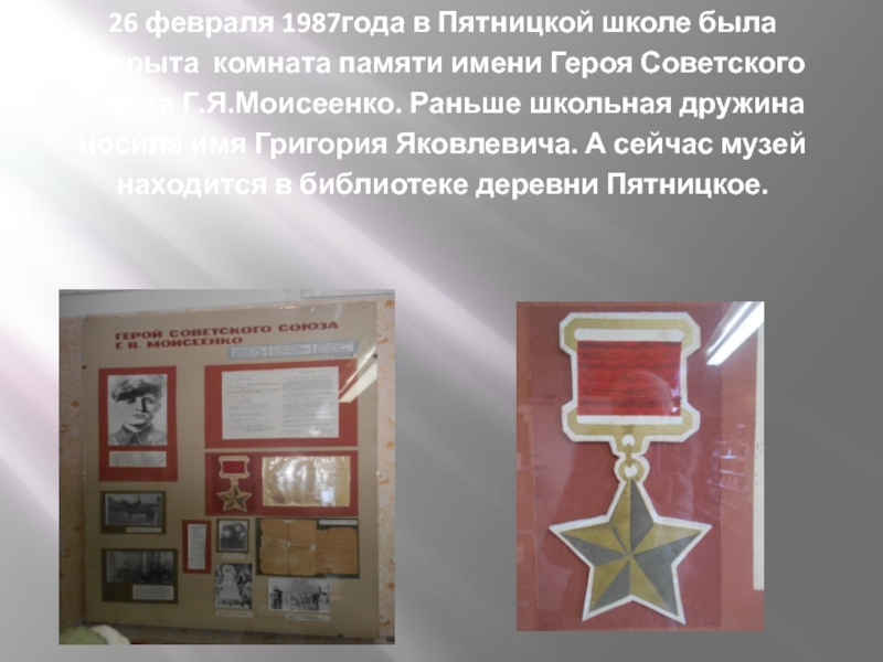 Героя Советского Союза Г.Я.Моисеенко. Раньше школьная дружина носила имя Григория Яковлевича. А сейчас музей находится в библиотеке деревни Пятницкое.
