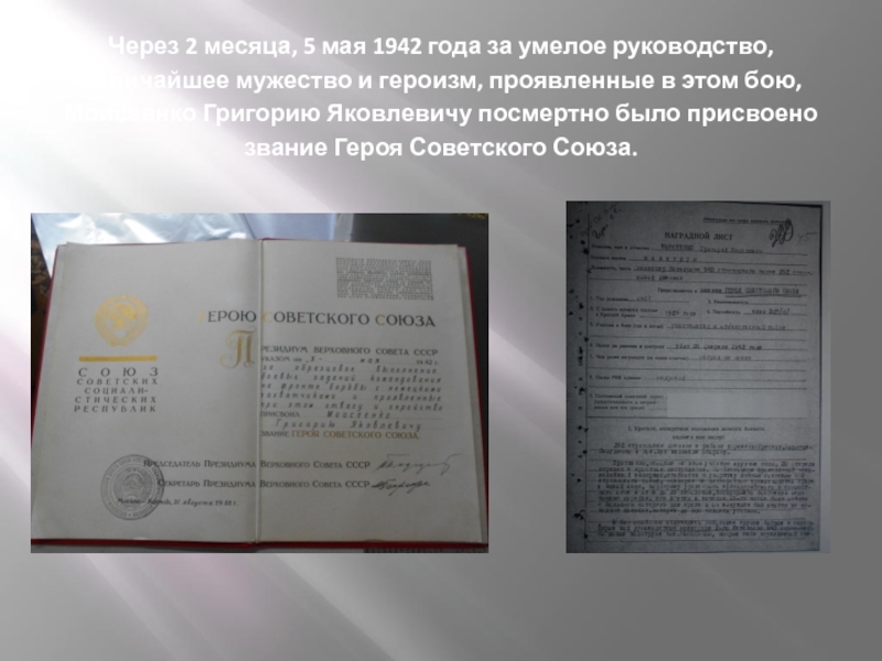 Слайд 12Через 2 месяца, 5 мая 1942 года за умелое руководство, величайшее