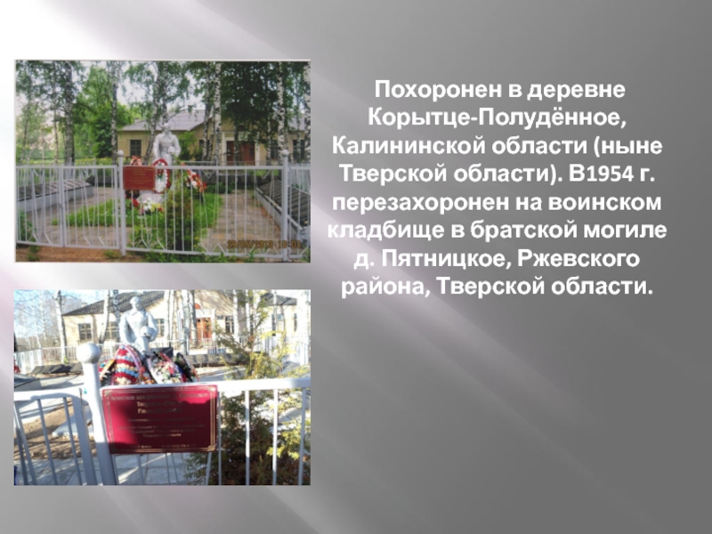 Слайд 9 Похоронен в деревне Корытце-Полудённое, Калининской области (ныне Тверской области). В1954