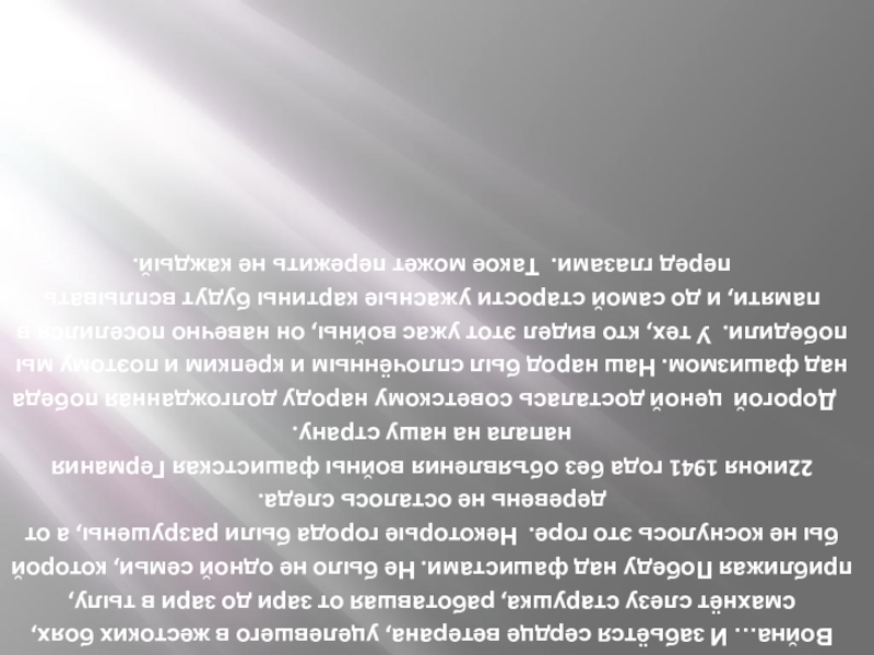 Дорогой ценой досталась советскому народу долгожданная победа над фашизмом. Наш народ был сплочённым и крепким и поэтому мы победили. У тех, кто видел этот ужас войны, он навечно поселился в памяти, и до самой старости ужасные картины будут всплывать перед глазами. Такое может пережить не каждый.