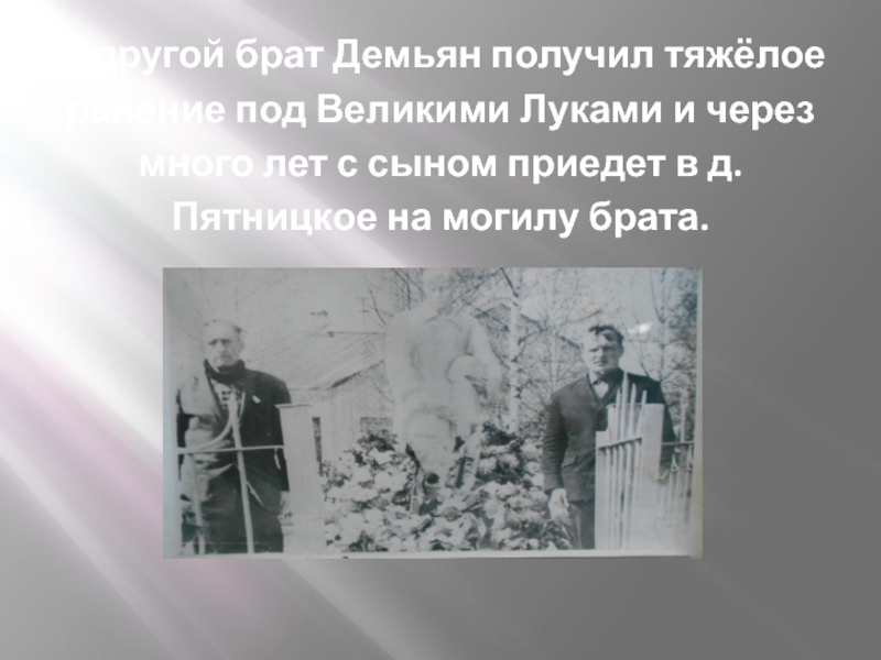 Слайд 14А другой брат Демьян получил тяжёлое ранение под Великими Луками и