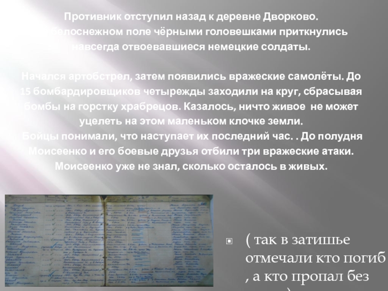 ( так в затишье отмечали кто погиб , а кто пропал без вести.)
