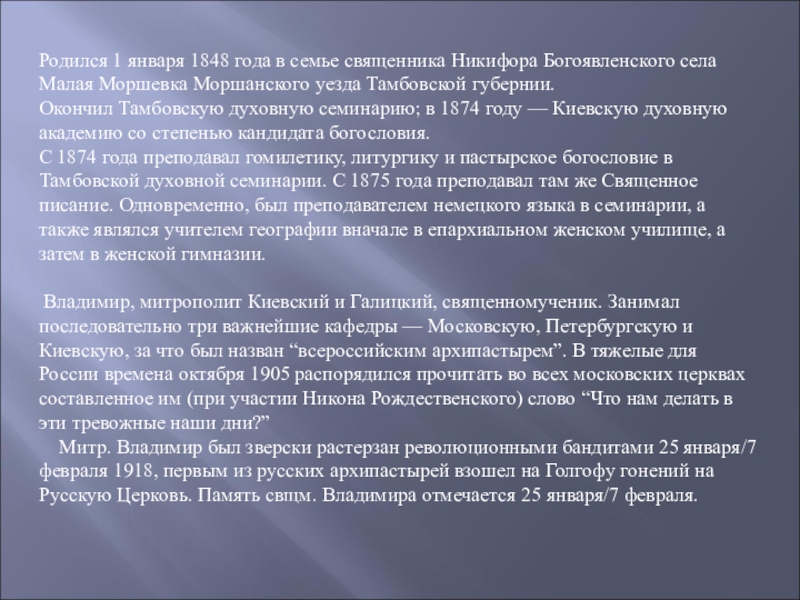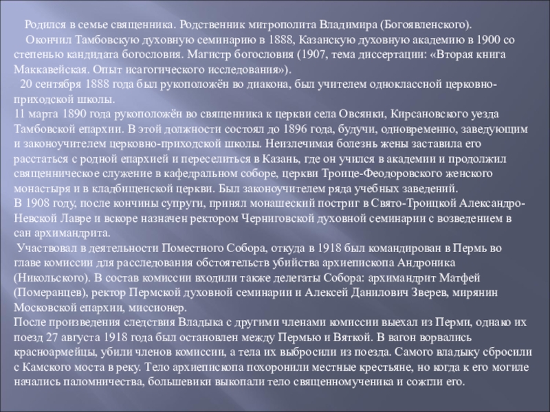 Слайд 7 Родился в семье священника. Родственник митрополита Владимира (Богоявленского).