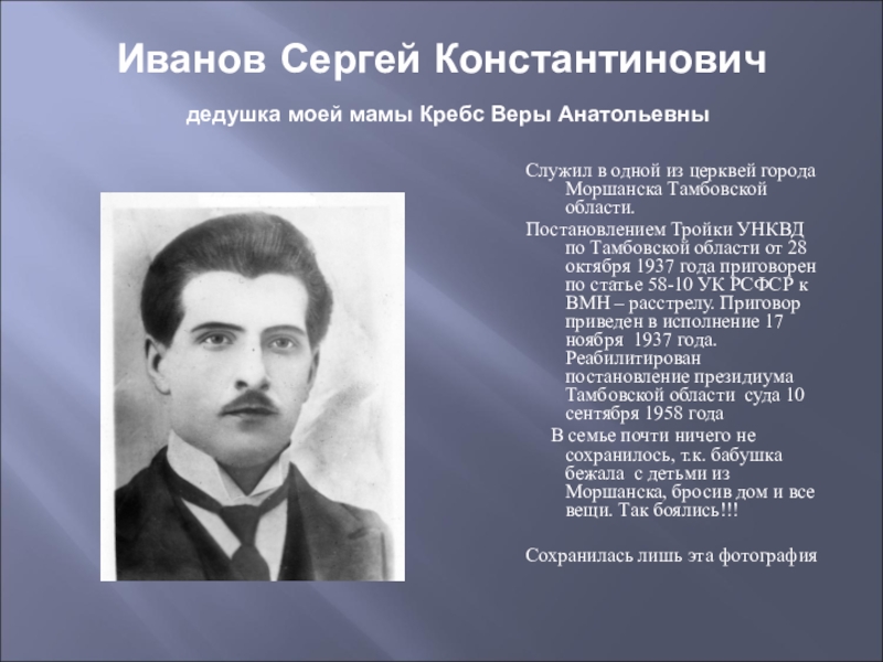 В семье почти ничего не сохранилось, т.к. бабушка бежала с детьми из Моршанска, бросив дом и все вещи. Так боялись!!!