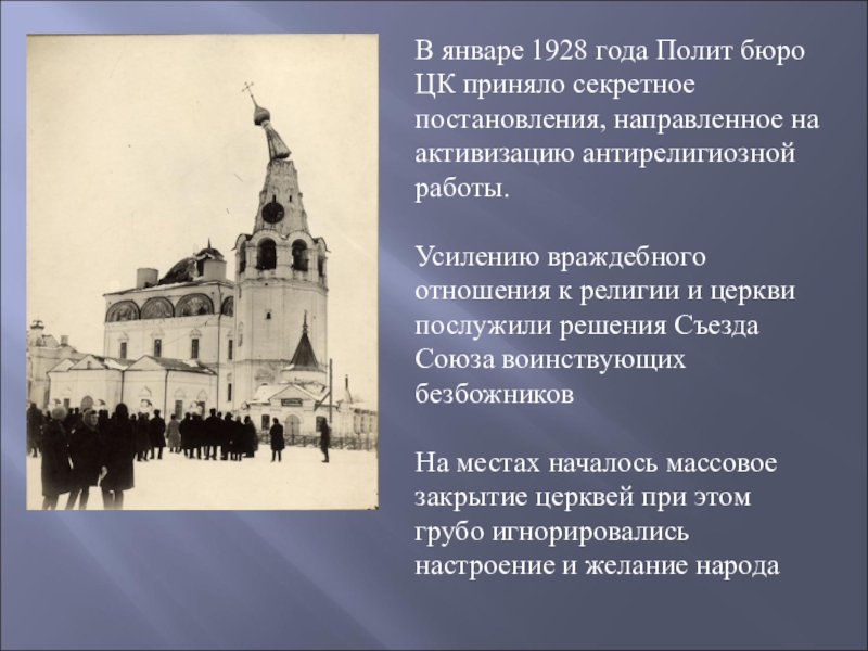 Усилению враждебного отношения к религии и церкви послужили решения Съезда Союза воинствующих безбожников