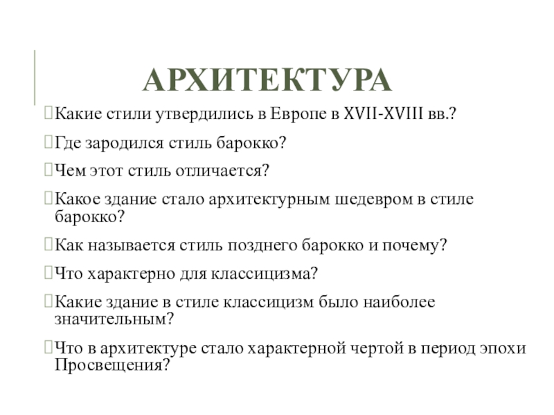 АрхитектураКакие стили утвердились в Европе в XVII-XVIII вв.?Где зародился стиль барокко?Чем этот стиль отличается?Какое здание стало архитектурным