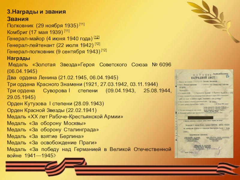 [1 ] Представление на награждение Орденом Суворова первой степени №: 1261575 от: 30.08.1943