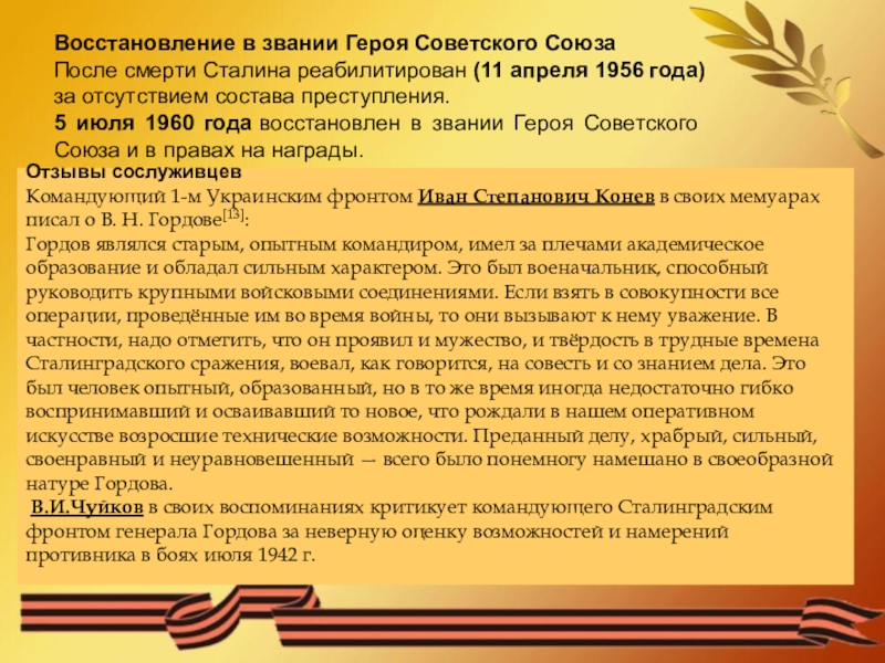 В.И.Чуйков в своих воспоминаниях критикует командующего Сталинградским фронтом генерала Гордова за неверную оценку возможностей и намерений противника в боях июля 1942 г.