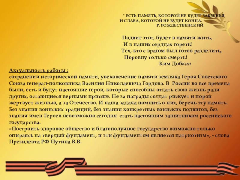 сохранении исторической памяти, увековечение памяти земляка Героя Советского Союза генерал-полковника Василия Николаевича Гордова. В России во все времена были, есть и будут настоящие герои, которые способны отдать свою жизнь ради других, остающиеся верными присяге. Не за награды солдат рискует и порой жертвует жизнью, а за Отечество. И наша задача помнить о них, беречь эту память. Без знания воинских традиций, без знания конкретных воинских подвигов, без знания имен Героев невозможно сегодня стать настоящим защитником российского государства.