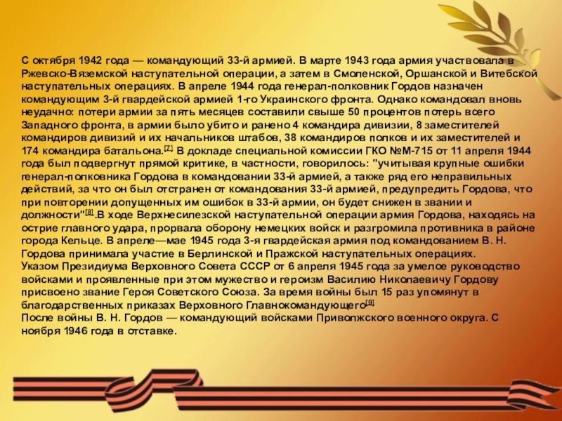 Слайд 7С октября 1942 года — командующий 33-й армией. В марте 1943