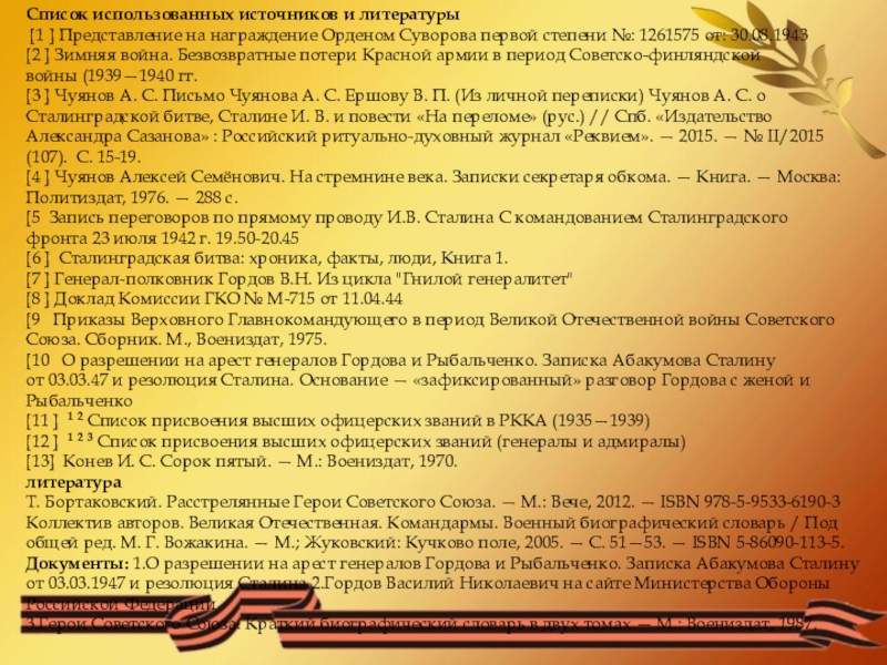 Документы: 1.О разрешении на арест генералов Гордова и Рыбальченко. Записка Абакумова Сталину от 03.03.1947 и резолюция Сталина.2.Гордов Василий Николаевич на сайте Министерства Обороны Российской Федерации