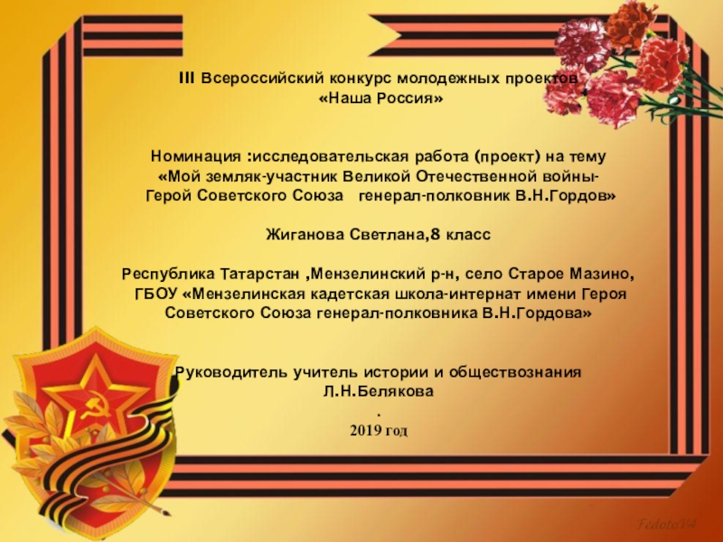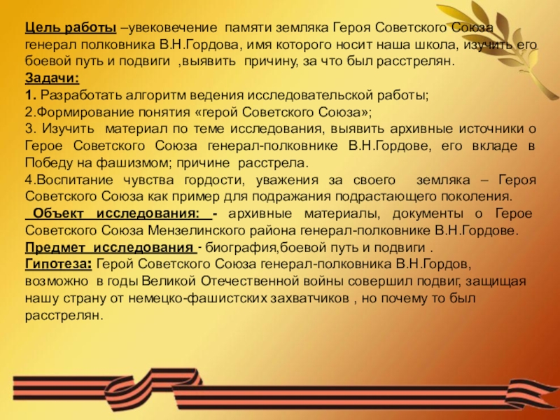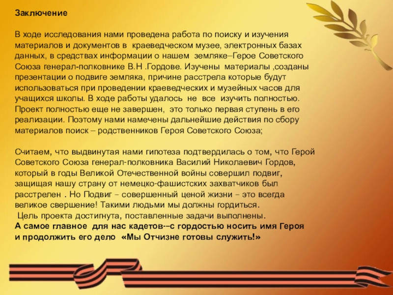 материалов и документов в краеведческом музее, электронных базах данных, в средствах информации о нашем земляке–Герое Советского Союза генерал-полковнике В.Н .Гордове. Изучены материалы ,созданы презентации о подвиге земляка, причине расстрела которые будут использоваться при проведении краеведческих и музейных часов для учащихся школы. В ходе работы удалось не все изучить полностью. Проект полностью еще не завершен, это только первая ступень в его реализации. Поэтому нами намечены дальнейшие действия по сбору материалов поиск – родственников Героя Советского Союза;