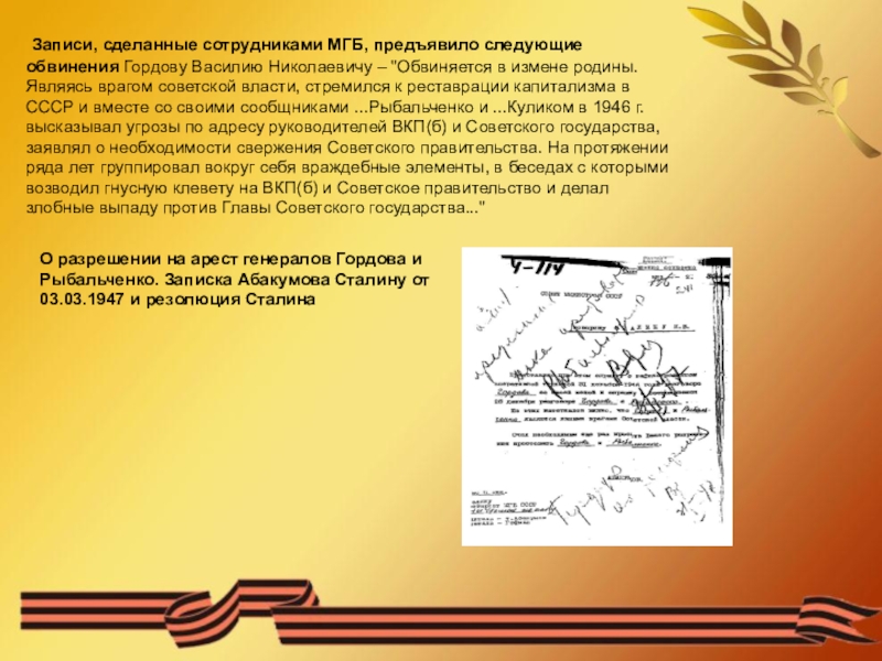 Слайд 10 Записи, сделанные сотрудниками МГБ, предъявило следующие обвинения Гордову Василию Николаевичу –