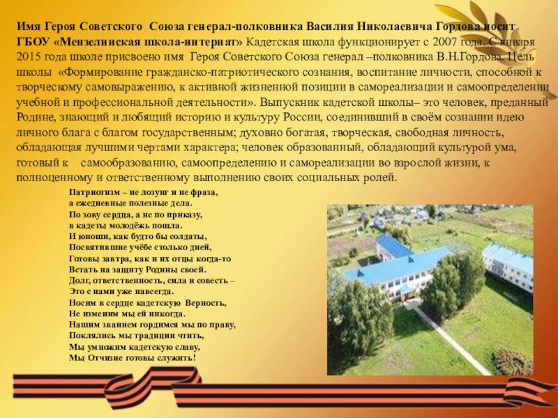 школа-интернат» Кадетская школа функционирует с 2007 года. С января 2015 года школе присвоено имя Героя Советского Союза генерал –полковника В.Н.Гордова. Цель школы «Формирование гражданско-патриотического сознания, воспитание личности, способной к творческому самовыражению, к активной жизненной позиции в самореализации и самоопределении учебной и профессиональной деятельности». Выпускник кадетской школы– это человек, преданный Родине, знающий и любящий историю и культуру России, соединивший в своём сознании идею личного блага с благом государственным; духовно богатая, творческая, свободная личность, обладающая лучшими чертами характера; человек образованный, обладающий культурой ума, готовый к самообразованию, самоопределению и самореализации во взрослой жизни, к полноценному и ответственному выполнению своих социальных ролей.