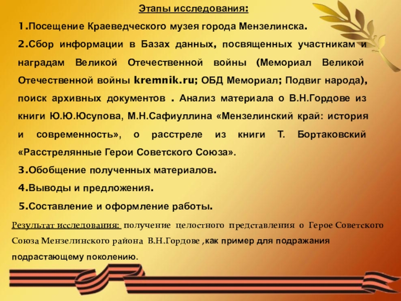 Результат исследования: получение целостного представления о Герое Советского Союза Мензелинского района В.Н.Гордове ,как пример для подражания подрастающему поколению.