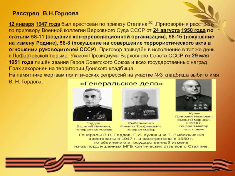 Слайд 912 января 1947 года был арестован по приказу Сталина[10] .Приговорён к расстрелу по приговору
