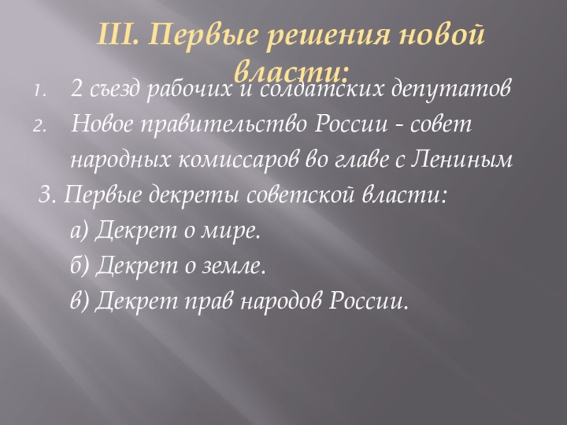 б) декларирование проведения аграрной реформы на основе принципа передачи земли тем, кто ее обрабатывает (на деле вопрос отложен до Учредительного собрания)