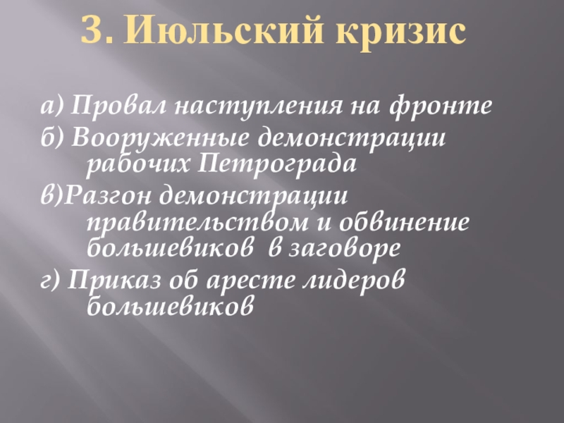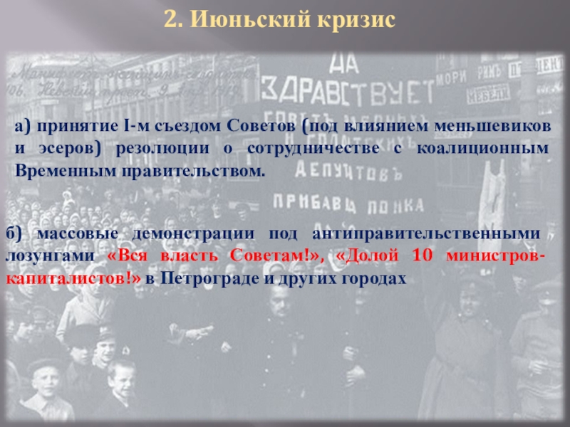 б) массовые демонстрации под антиправительственными лозунгами «Вся власть Советам!», «Долой 10 министров-капиталистов!» в Петрограде и других городах