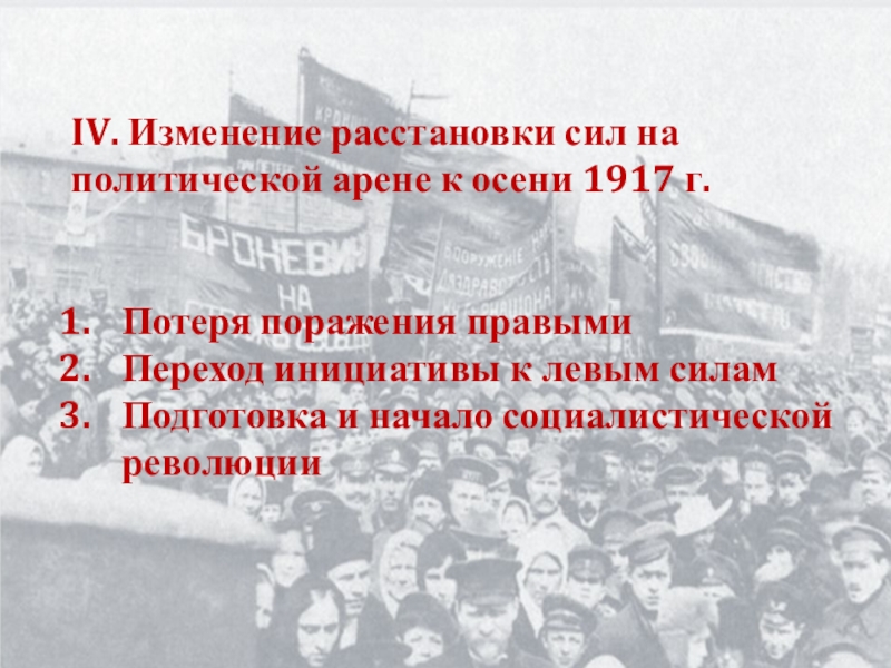 5. Разгром правых сил, падение престижа А.Ф.Керенского и конституционных демократов, усиление
