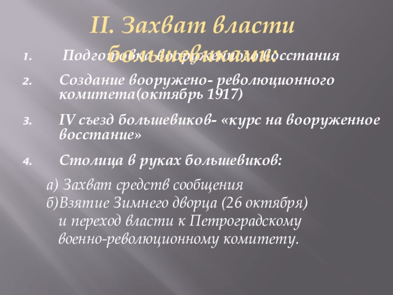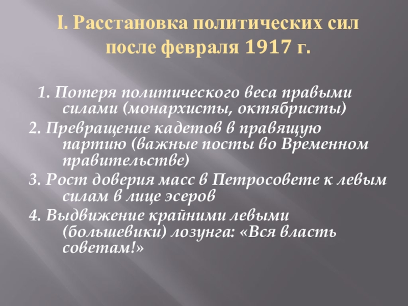 Г) Апрельские тезисы В.И. Ленина о переходе революции к следующему этапу – победе социализма, который даст «власть в руки пролетариата и беднейшего крестьянства»